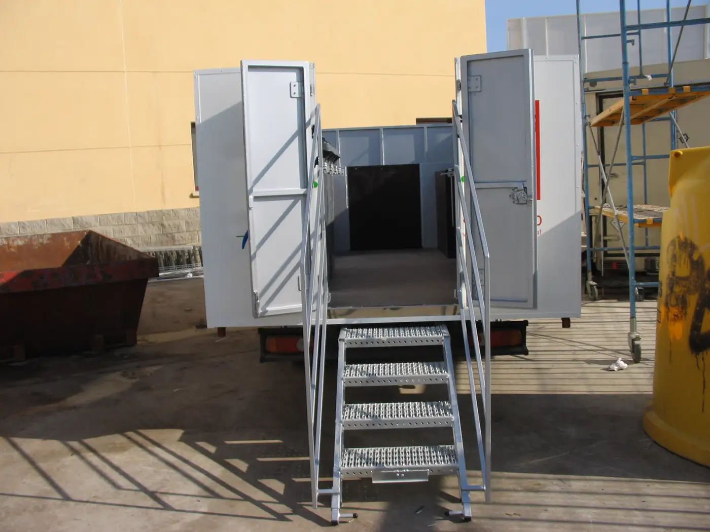 Camió amb caixa equipada amb un lateral abatible cap amunt i obertura posterior, que permeten convertir-lo en un espai obert i accessible. Disposa d’escales d’accés i interior amb taulell, prestatgeries i pantalla.