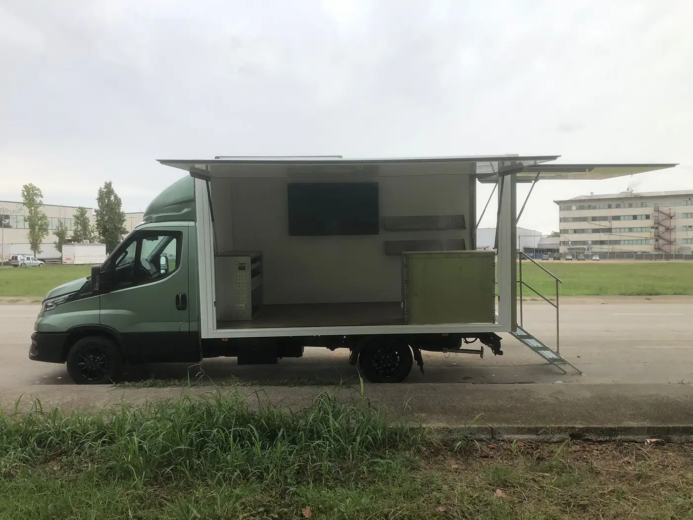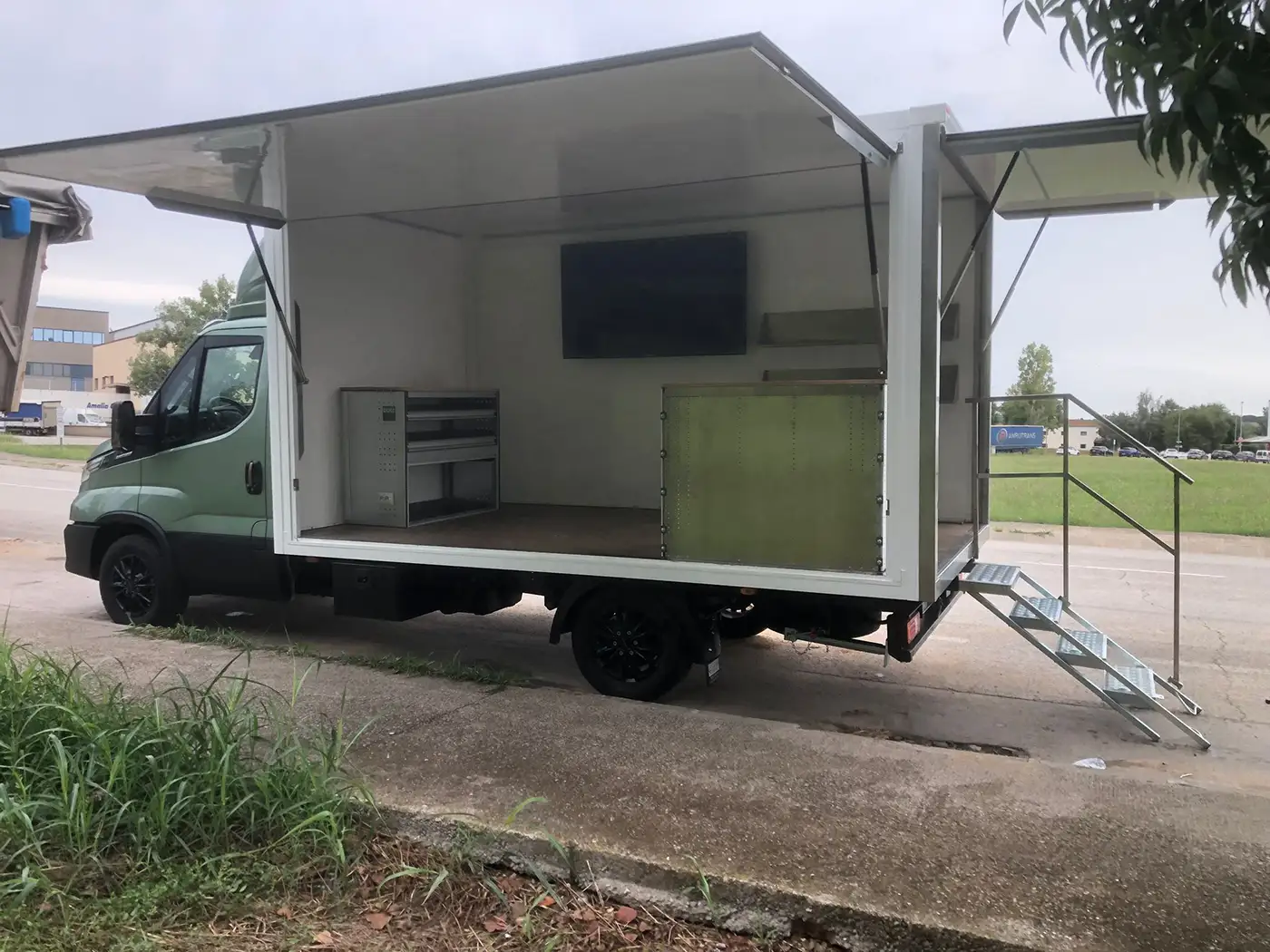Camió amb caixa i laterals abatibles cap amunt, que generen un espai obert a banda i banda. Inclou escales d’accés, taulell, prestatgeries i pantalla integrada.